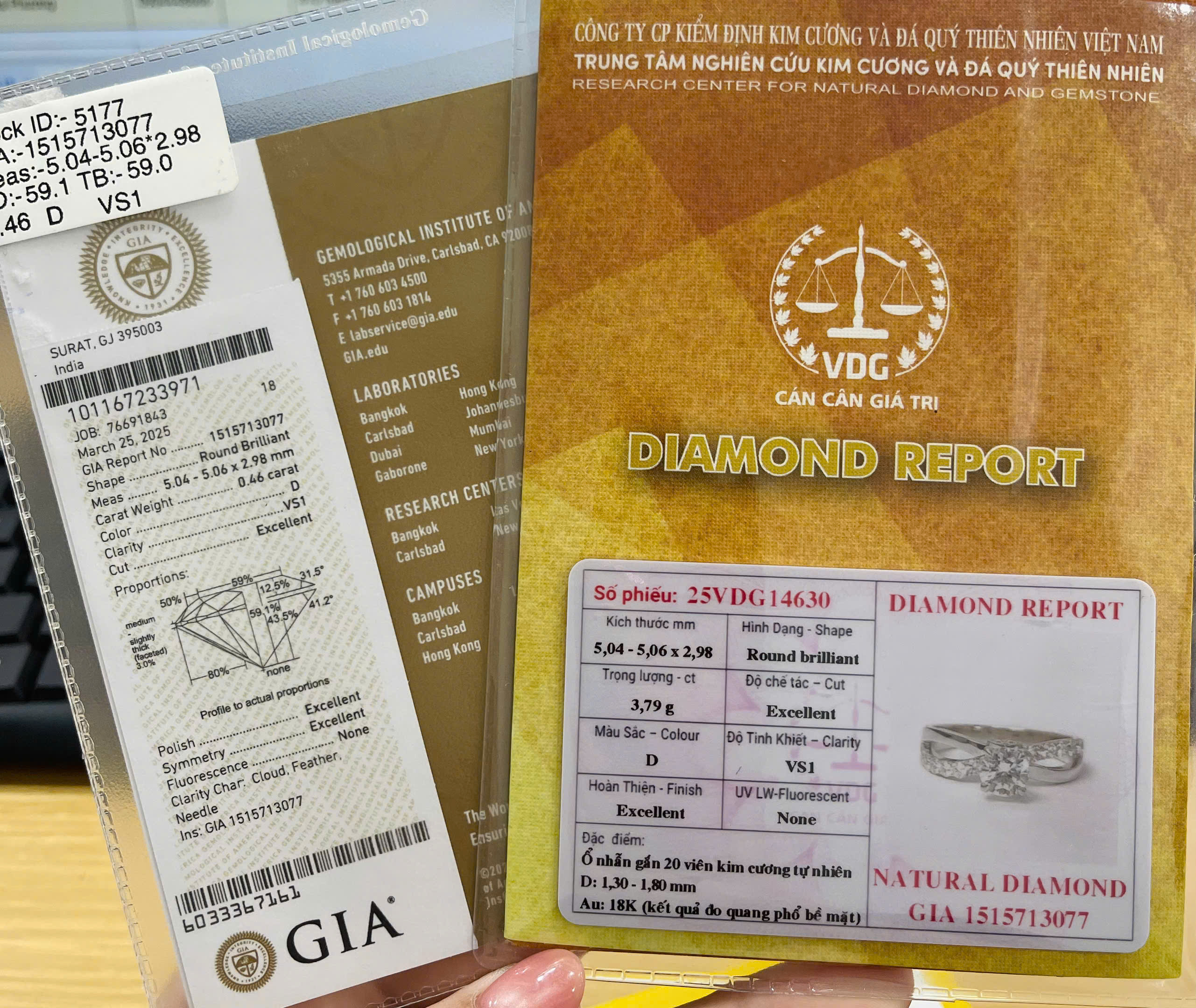 Nhẫn có đủ 2 giấy kiểm định của viên chủ và vỏ nhẫn